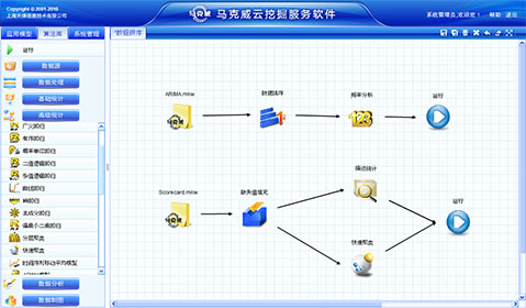 馬克威云挖掘軟件是數(shù)據(jù)分析軟件中以分布式架構的大型統(tǒng)計分析和數(shù)據(jù)挖掘軟件,具有完全自主知識產權(備案號2013SR092246)。馬克威云挖掘軟件能夠獲取云端數(shù)據(jù),如: HADOOP平臺、阿里云飛天平臺等,通過數(shù)據(jù)挖掘和統(tǒng)計分析算法建立概念模型,從海量數(shù)據(jù)中尋找規(guī)律和知識,為決策者提供科學的決策依據(jù)。目前運行單張表數(shù)據(jù)量為3.4T,處理速度為36秒左右。