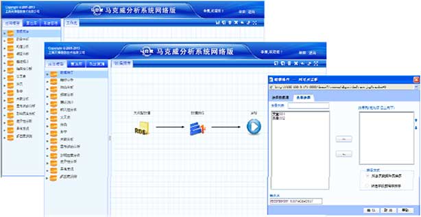 馬克威分析系統(tǒng)(網(wǎng)絡(luò)版)是一套純B/S(瀏覽器/服務(wù)器)架構(gòu)的大型統(tǒng)計(jì)分析和數(shù)據(jù)挖掘軟件,由上海天律信息技術(shù)有限公司獨(dú)立研制與開(kāi)發(fā),具有完全自主知識(shí)產(chǎn)權(quán)(備案號(hào)2020SR1908071),從海量信息和數(shù)據(jù)中尋找隱含的規(guī)律和潛在的知識(shí),通過(guò)統(tǒng)計(jì)分析和數(shù)據(jù)挖掘技術(shù)建立概念模型,為決策者提供科學(xué)的決策依據(jù)。