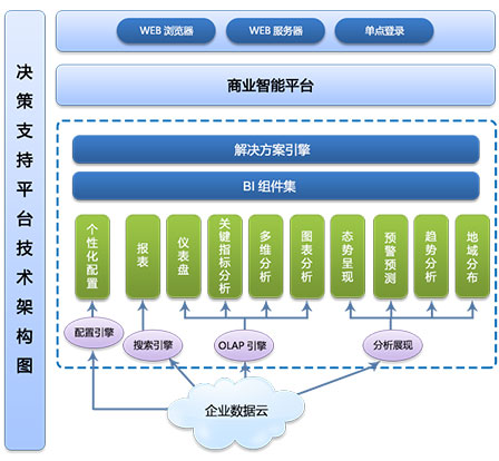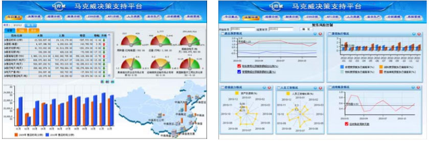 馬克威決策支持平臺(tái)包括:態(tài)勢(shì)呈現(xiàn)與比較、指標(biāo)評(píng)估與預(yù)警、趨勢(shì)分析和預(yù)測(cè)、地域分布呈現(xiàn)、決策模型、多維分析、可視化視圖、自由配置等功能。