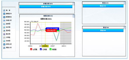 趨勢(shì)分析和預(yù)測(cè)功能以圖形方式展現(xiàn)指標(biāo)的歷史趨勢(shì)變化情況,展現(xiàn)方式可以自由選擇(包括柱狀圖、餅圖、曲線圖等)。同時(shí)平臺(tái)還提供了指標(biāo)的預(yù)測(cè)功能,輔助用戶進(jìn)行決策。